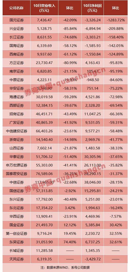 净利润方面,29家券商中有24家环比下滑,单月净利亏损的券商更多达7家。除了太平洋、东方、光大、财通、银河等券商尚未披露10月财报。
