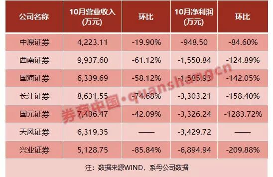 WIND数据显示,10月净利润超过1个亿的上市券商只有6家,分别是中信3.8亿、华泰3.03亿、国君2.83亿、申万宏源2.61亿、国信1.53亿、招商1.10亿元。